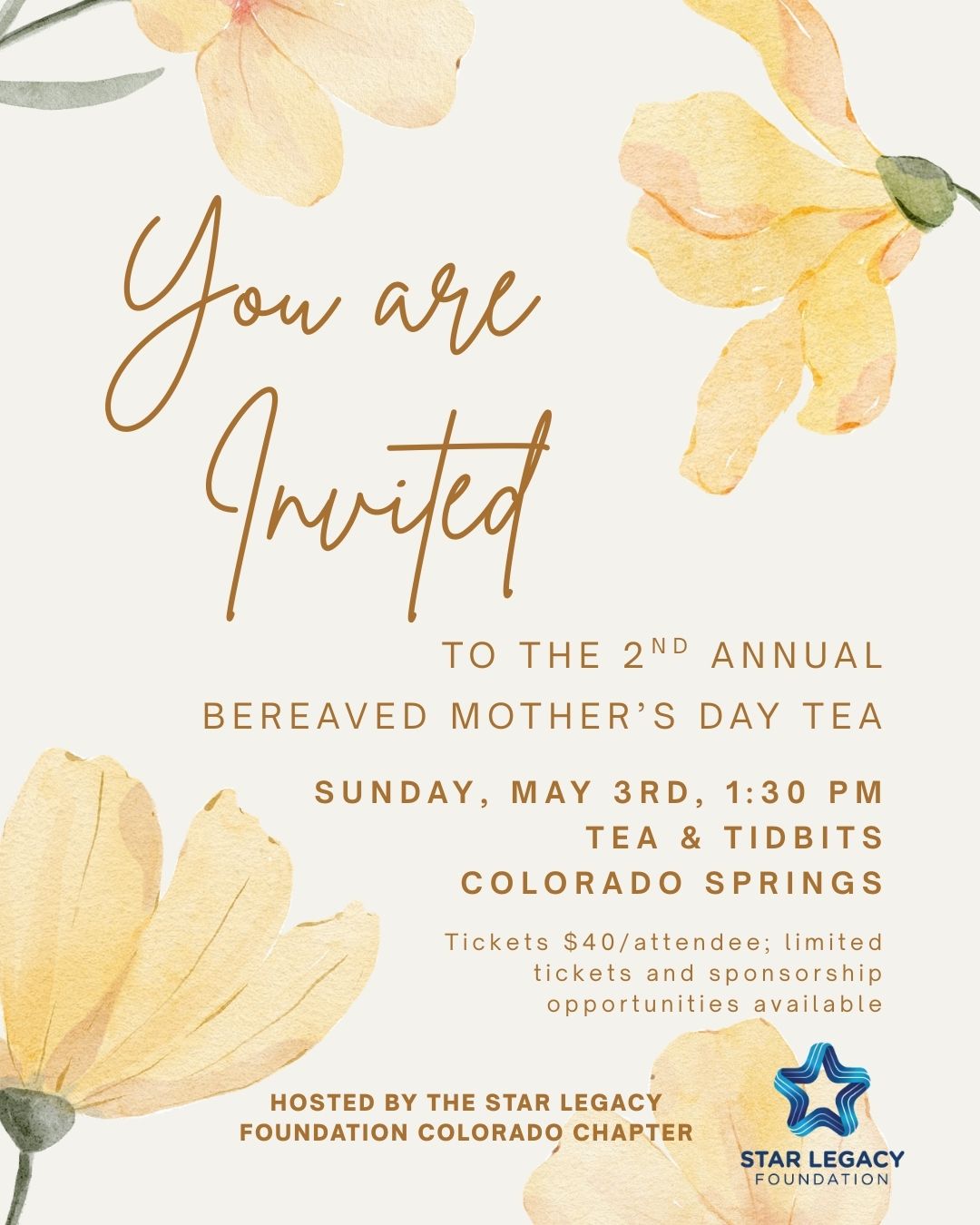 You're Invited to our 2nd Annual Bereaved Mothers' Day Tea, hosted by the Colorado Chapter of the Star Legacy Foundation! We invite all bereaved mothers and their communities to join us and support us. This unique tea will be hosted by Tea and Tidbits in Colorado Springs, and promises an intimate, thoughtful opportunity to be […]
