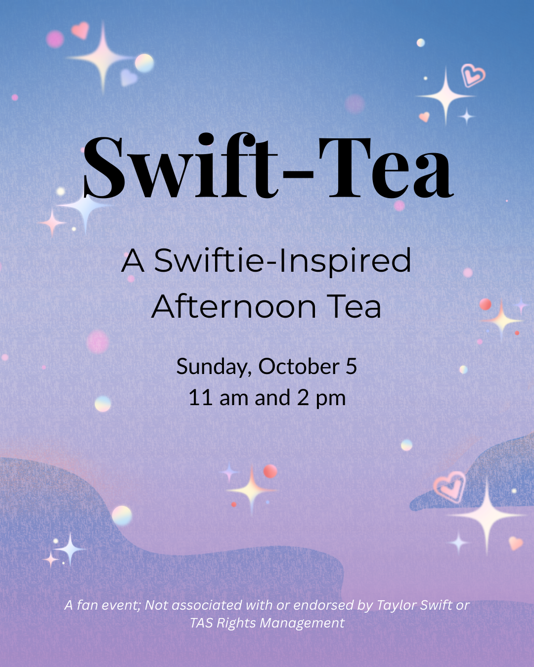 ✨ Join us for The Swift-tea, a Swiftie celebration in anticipation of Taylor’s newest album! Enjoy Era-inspired bites, tea flights, trivia, bracelet making, and photo ops at our shimmer wall. Two seatings only — dress for your Era and celebrate with us!